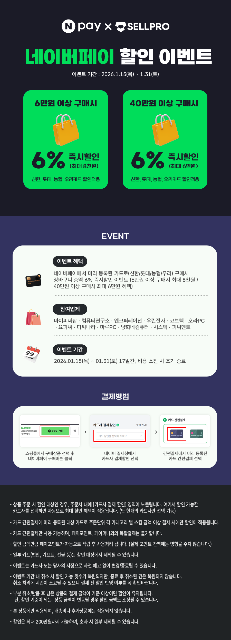 아래 쇼핑몰에서 네이버페이로 40만원 이상 결제 시 6% 즉시할인(최대 6만원)이 적용됩니다.